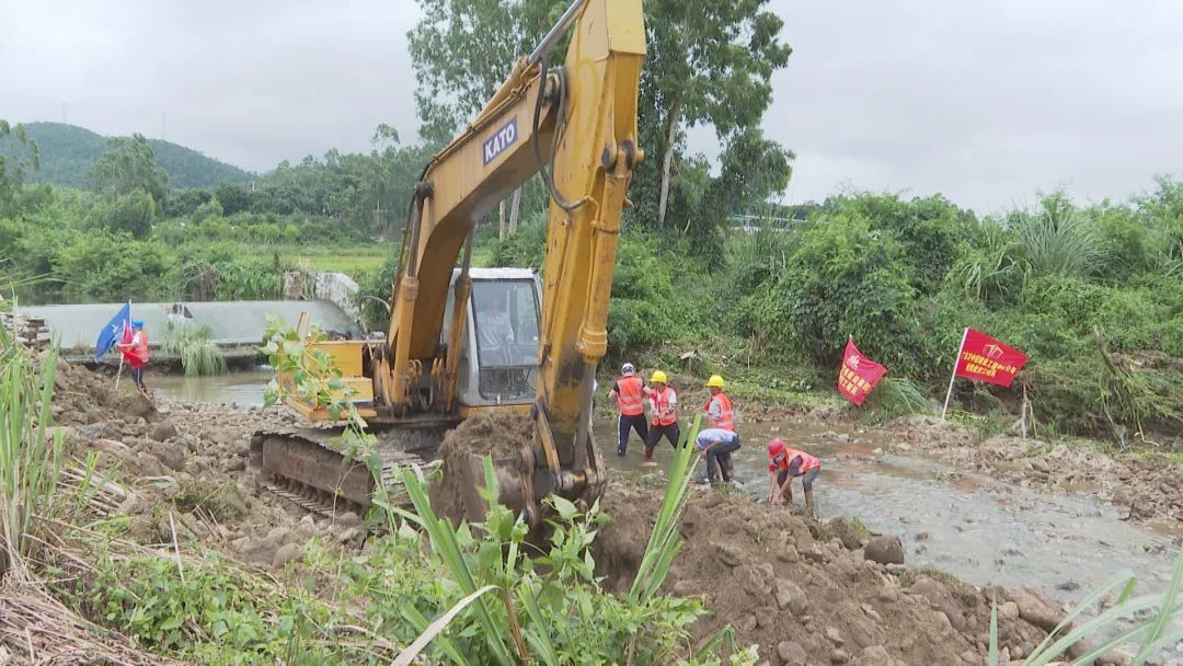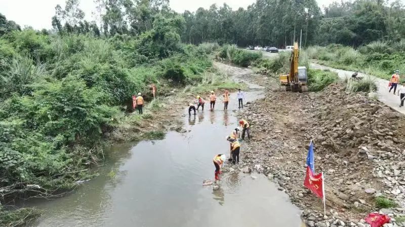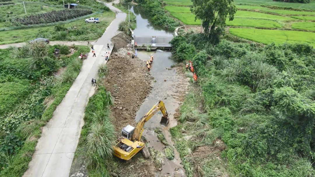 雙水村委會(huì)崩陂河,水陂的側(cè)邊陂體已被河水沖垮,河道全是散落的石頭和泥沙,如不及時(shí)搶險(xiǎn),再遇到降雨將會(huì)導(dǎo)致路基損毀和下游農(nóng)田被淹。三家企業(yè)自發(fā)組建的搶險(xiǎn)救災(zāi)隊(duì)伍在現(xiàn)場(chǎng)利用機(jī)械和人力,對(duì)河道進(jìn)行疏通,將陂體的泥沙進(jìn)行回填。