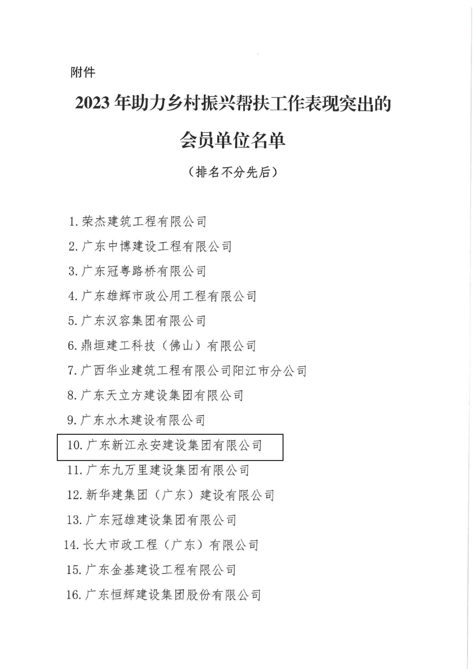 關(guān)于對(duì)助力鄉(xiāng)村振興幫扶工作表現(xiàn)突出單位進(jìn)行通報(bào)表?yè)P(yáng)的決定各會(huì)員單位: 我會(huì)秉承“飲水思源,回報(bào)社會(huì)”的理念,制定了《廣東省市政行業(yè)協(xié)會(huì)鄉(xiāng)村振興活動(dòng)方案》,發(fā)動(dòng)廣大會(huì)員單位共同參與鄉(xiāng)村振興活動(dòng),助力粵東西北貧困地區(qū)建設(shè)項(xiàng)目幫扶服務(wù)或產(chǎn)業(yè)對(duì)口合作,得到了當(dāng)?shù)卣腿嗣袢罕姷母叨仍u(píng)價(jià)為全省市政企業(yè)助力鄉(xiāng)村振興做好典型示范工作。 為表?yè)P(yáng)先進(jìn)、弘揚(yáng)正氣,經(jīng)研究決定,我會(huì)對(duì)榮杰建筑工程有限公司等 37 家積極參與助力鄉(xiāng)村振興幫扶工作表現(xiàn)突出的會(huì)員單位予以通報(bào)表?yè)P(yáng),希望受表?yè)P(yáng)的會(huì)員單位再接再厲,發(fā)揮榜樣示范作用,引領(lǐng)我省廣大市政行業(yè)企業(yè)積極參與鄉(xiāng)村振興工作。希望全體會(huì)員單位向受表?yè)P(yáng)的單位學(xué)習(xí)認(rèn)真貫徹落實(shí)黨的二十大報(bào)告關(guān)于推進(jìn)鄉(xiāng)村振興的精神和部署,在鄉(xiāng)村振興這個(gè)廣闊舞臺(tái)上發(fā)揮作用、體現(xiàn)價(jià)值、展現(xiàn)風(fēng)采,為推進(jìn)鄉(xiāng)村振興和“百縣千鎮(zhèn)萬(wàn)村高質(zhì)量發(fā)展工程”,促進(jìn)城鄉(xiāng)區(qū)域協(xié)調(diào)發(fā)展做出更大貢獻(xiàn)展現(xiàn)廣東市政人的精神風(fēng)貌。 附件:2023 年助力鄉(xiāng)村振興幫扶工作表現(xiàn)突出的會(huì)員單位名單 廣東省市政行業(yè)協(xié)會(huì) 2024年1月5日